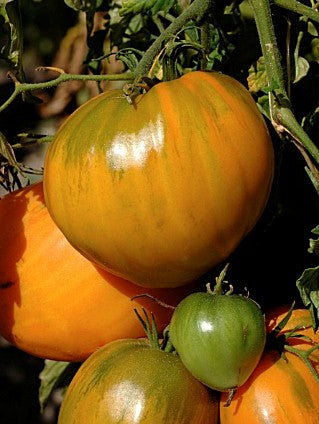 85 days. 20 seeds. The Verna Orange Tomato is an heirloom variety that originated in Indiana, USA. These oxheart tomatoes weigh about 10 to 16 ounces and are light golden-orange on the outside with a beautiful persimmon colored interior that has few seeds. They taste very fruit-like and the yields are good. They are great in salads, sandwiches and are used to make orange tomato sauce. Indeterminate. Open pollinated seeds.